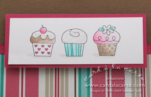 So I did sugar up my cupcakes with a little dazzling diamonds but if you take a closer look, you'll see (very hard to catch the real effect on a photo) that the soft suede layer is shimmering...I simply misted it with a mix of rubbing alcohol and champagne shimmer paint, so easy and so beautiful. The effect is even more accentuated on a textured cardstock but I already had cut my pieces when I though about "shimmerizing" it. I'll try to keep it in mind next time...
